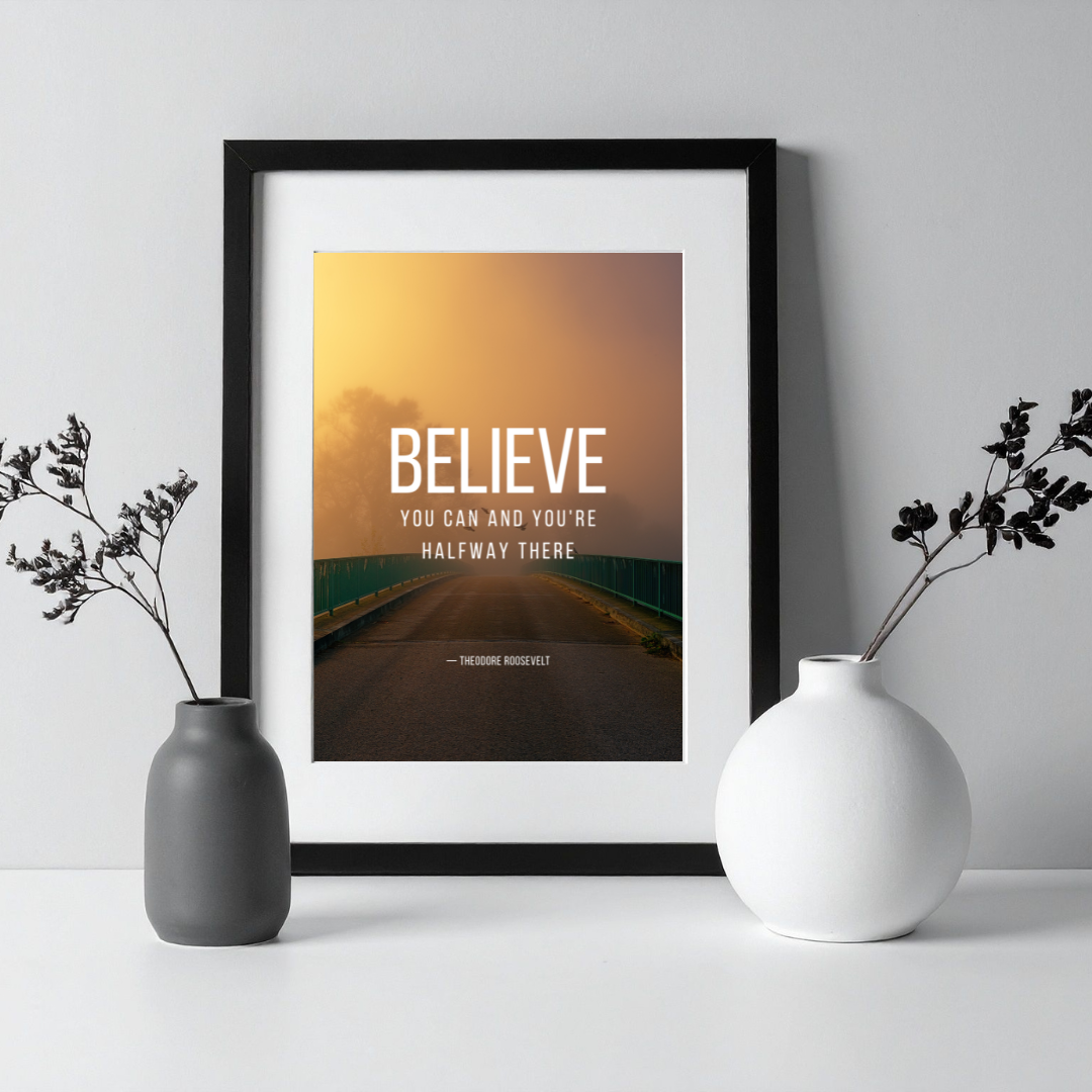 Empower your journey with this bold wall art, featuring Theodore Roosevelt’s famous quote: "Believe you can and you’re halfway there." Set against a captivating photo of a sunlit bridge leading into the morning mist, this high-quality print merges hope, confidence, and determination in one stunning image. Printed on premium art paper, it’s ideal for offices, classrooms, home gyms, or creative studios. Perfect as a gift for students, athletes, professionals, or anyone striving toward their goals, this artwork offers daily encouragement to believe in your abilities and take the next step. Elevate your space and mindset with this inspirational Roosevelt quote poster.