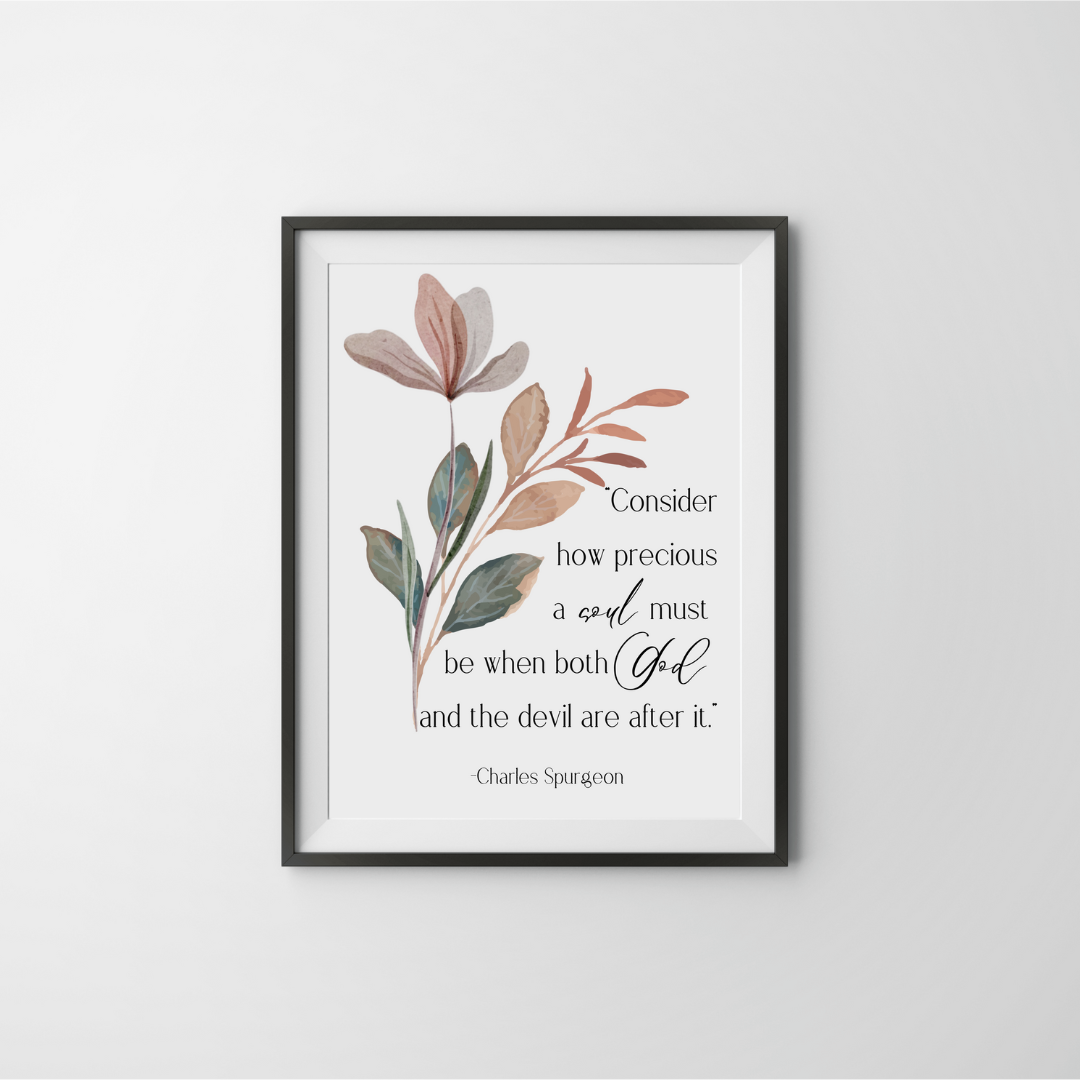 Reflect on the value of the soul with this beautiful wall art featuring a powerful quote from Charles Spurgeon: "Consider how precious a soul must be when both God and the devil are after it." Adorned with a subtle watercolor floral design in earthy tones, this print perfectly blends elegance and spiritual inspiration. Printed on high-quality material, this artwork is an uplifting addition to living rooms, bedrooms, offices, prayer nooks, or church spaces. An ideal Christian gift or daily encouragement, it reminds all who see it of their immense worth and the ongoing battle for the soul. Enhance your faith-based decor collection with this thoughtful and beautifully crafted Spurgeon quote print.