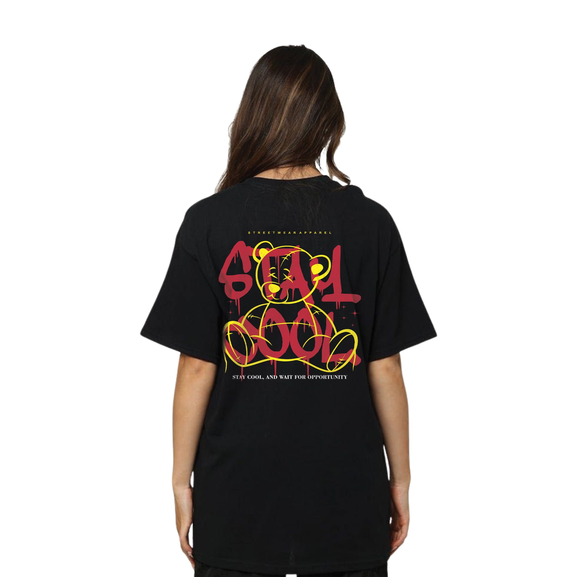 Turn heads and keep your vibe chill with the Stay Cool Graffiti Bear T-Shirt, built for lovers of bold, urban fashion. This unisex black tee features a striking graffiti-style teddy bear in bright yellow outlines and large red graffiti “Stay Cool” lettering across the back, along with the inspiring phrase "Stay cool, and wait for opportunity." Made from soft, high-quality cotton with a relaxed fit, it’s the perfect choice for streetwear fans who value comfort, creativity, and standout design.