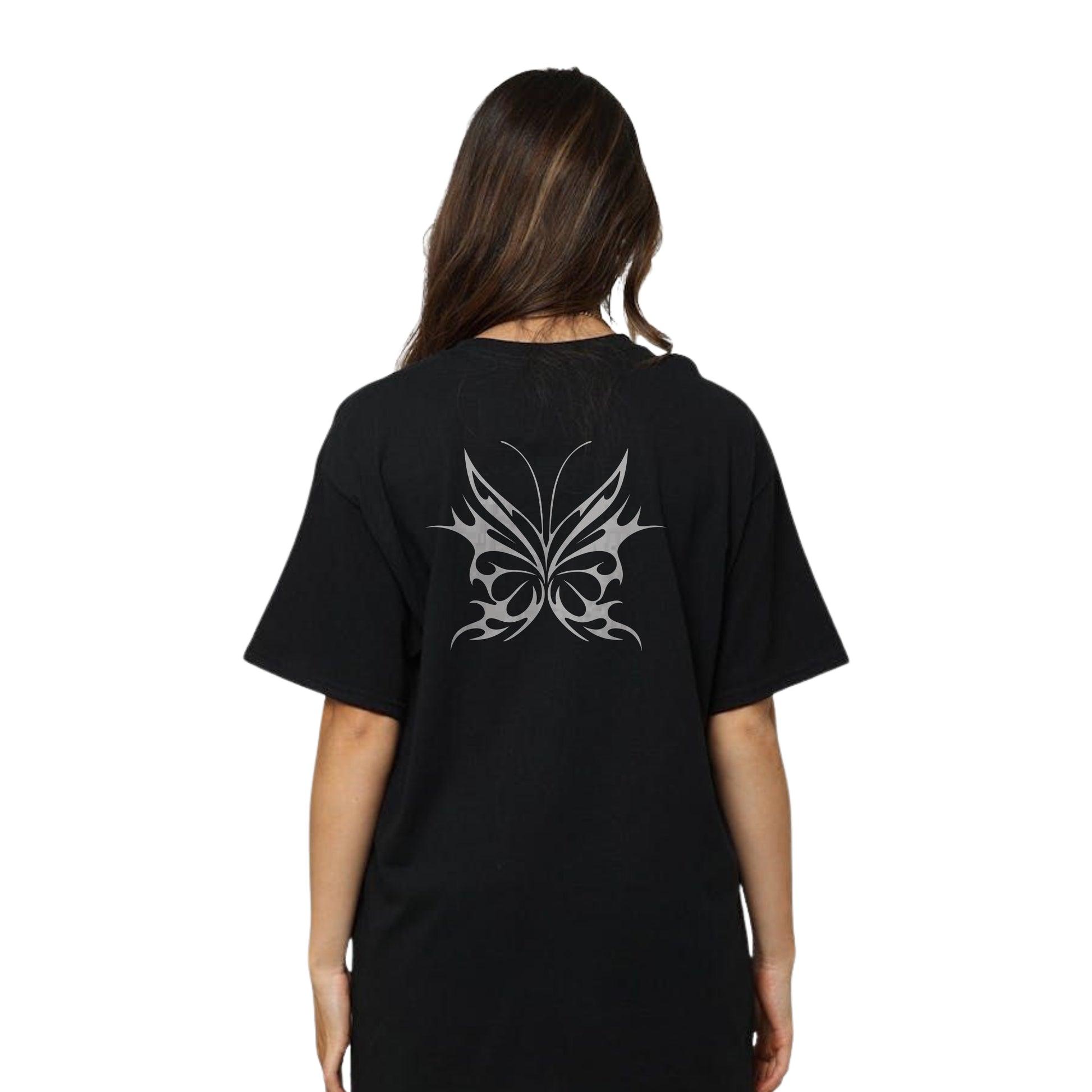 Show your bold side with this women’s oversized black T-shirt featuring a striking silver tribal butterfly graphic on the back. The unique butterfly design blends elegance and edge, making it the perfect statement piece for any streetwear-loving fashionista. Crafted from premium cotton, this relaxed-fit tee ensures all-day comfort, ideal for casual outings, concerts, or expressing your individuality in style.