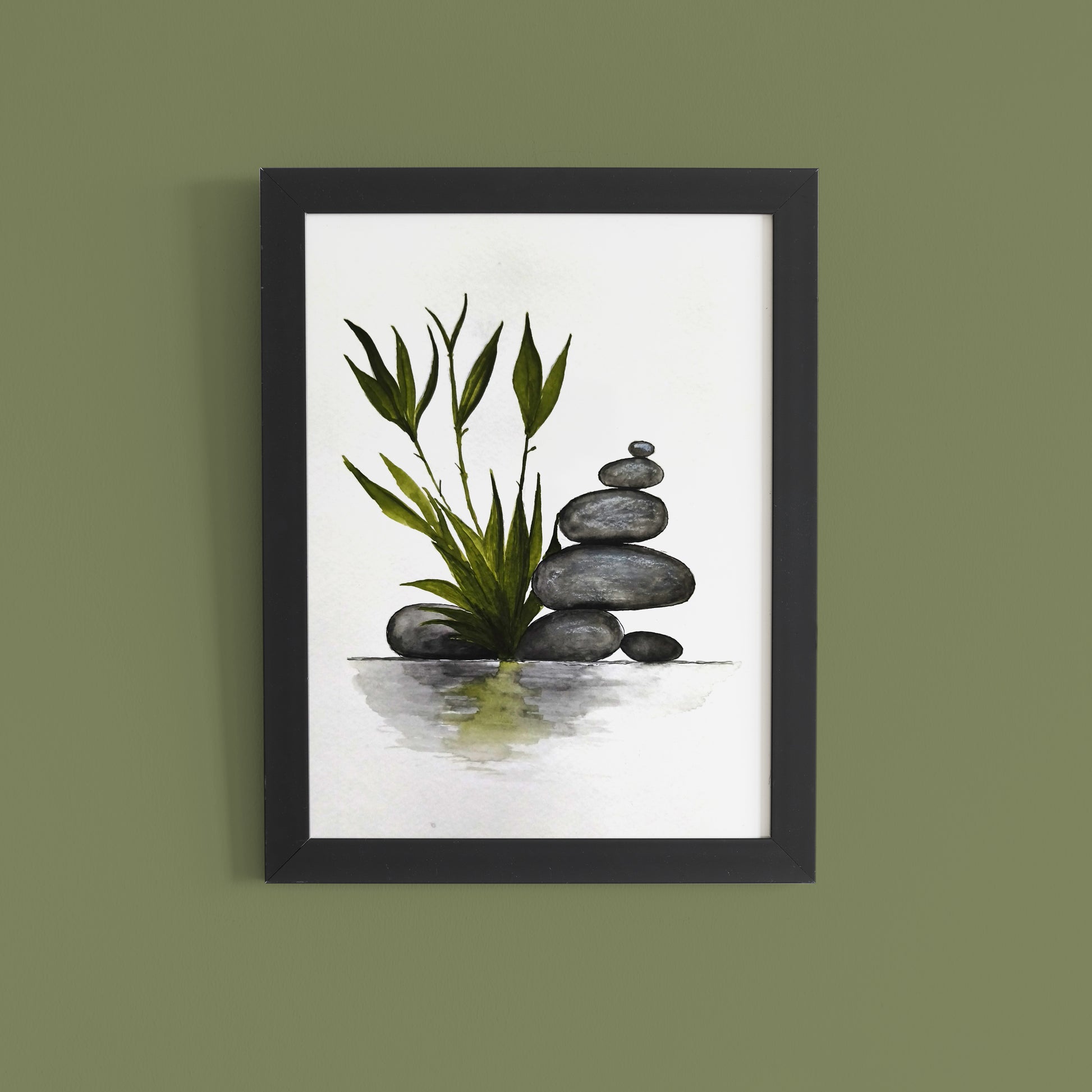 Create a serene atmosphere with this Zen Balance Watercolour Wall Art, featuring smooth stacked stones and bamboo leaves, symbolizing peace, harmony, and mindfulness.